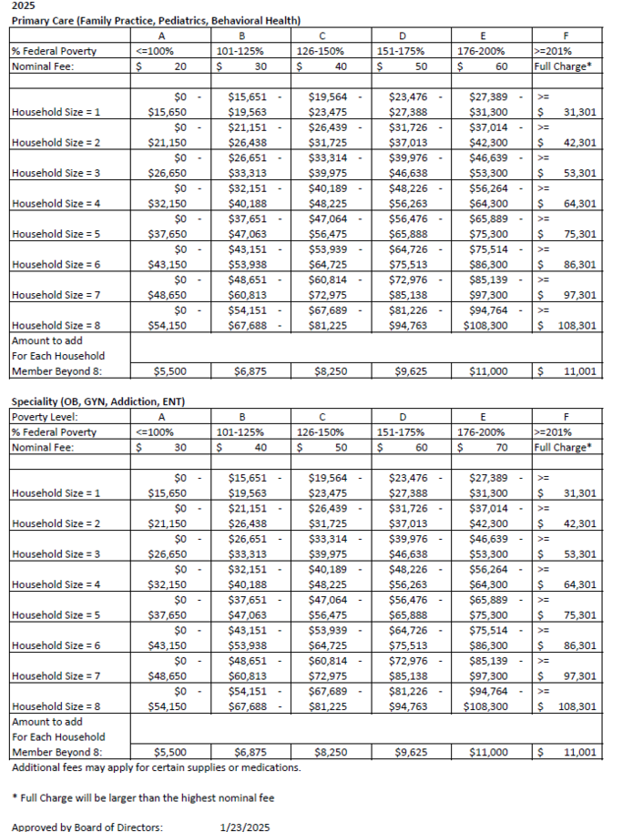 NeoHealth is a Federally Qualified Health Center, which allows us to offer a sliding fee scale to those without insurance. The sliding fee scale utilizes the federal poverty guidelines. Please bring proof of income to your appointment to utilize. Services will not be denied based on your ability to pay. Our current sliding fee scale is listed below: